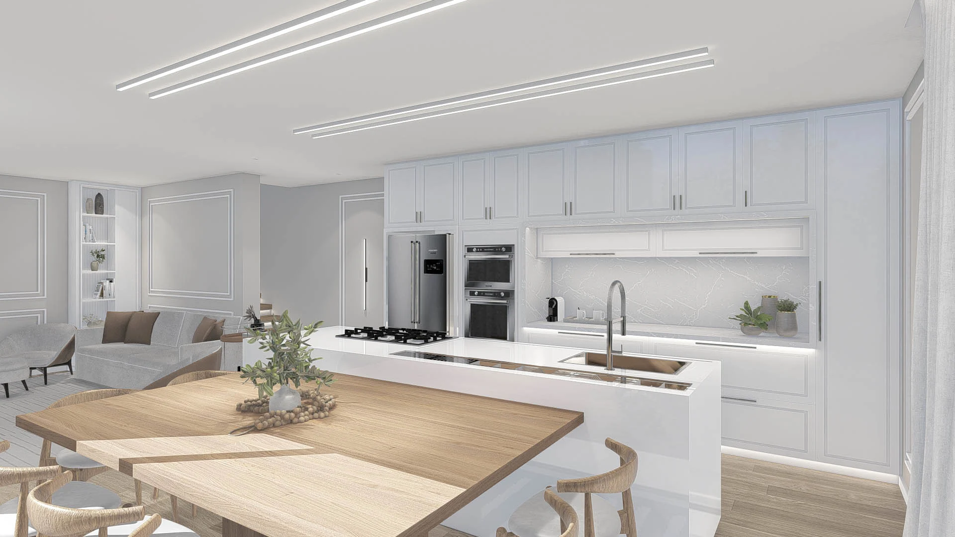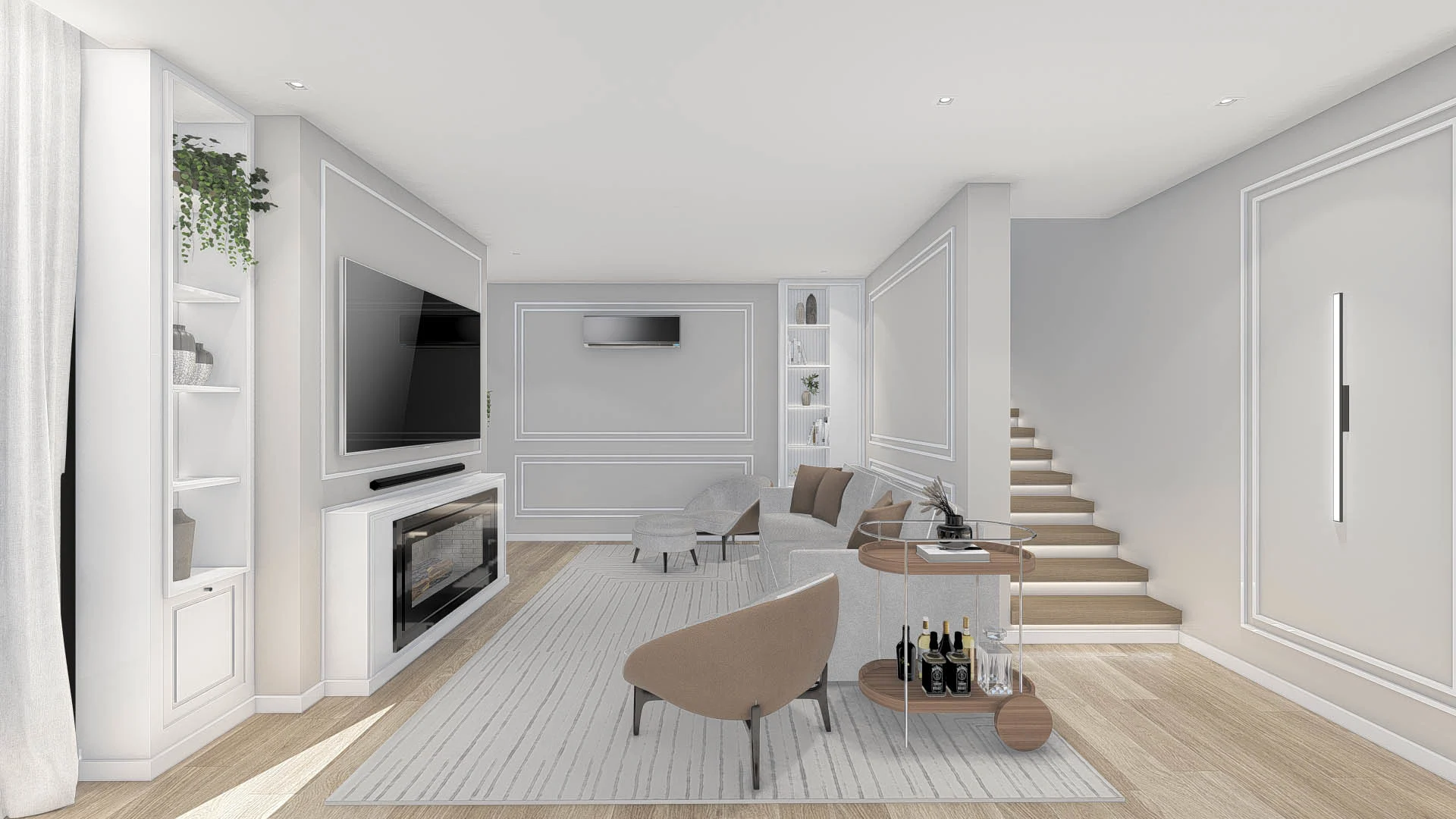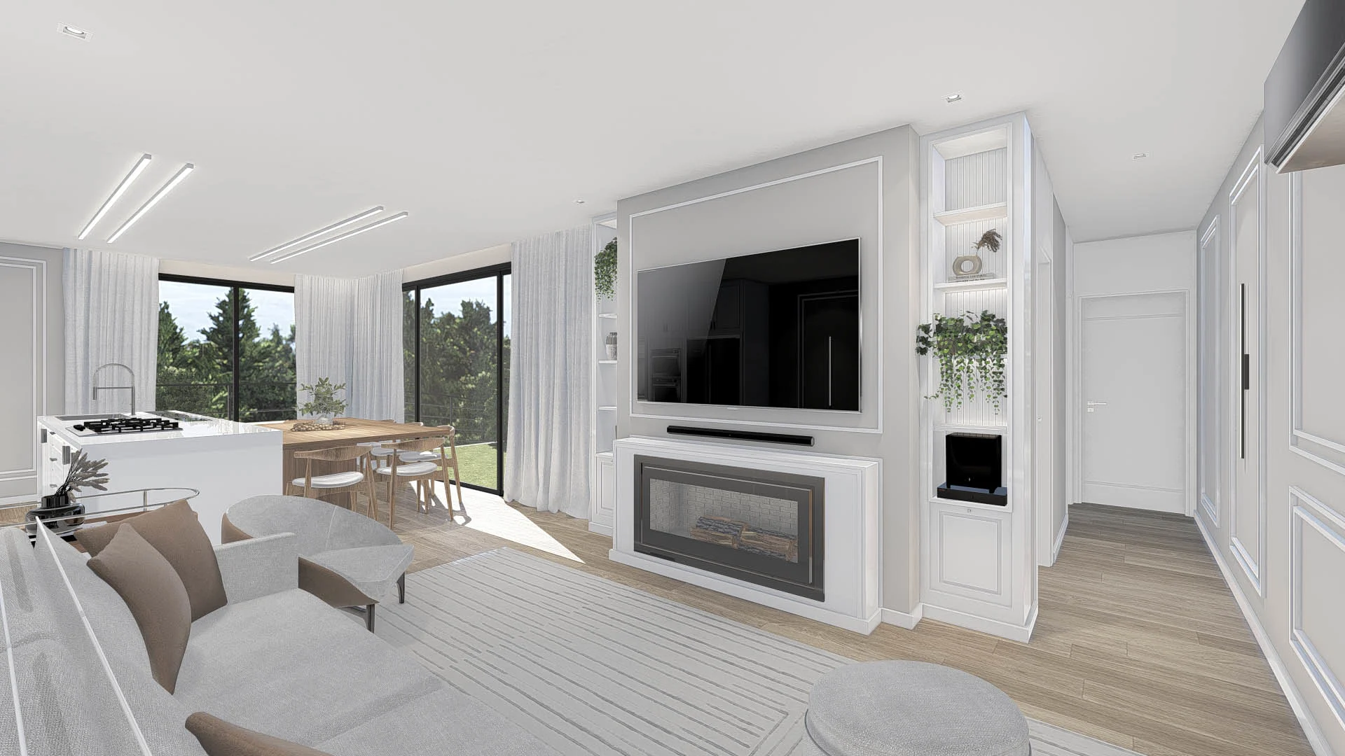 Um projeto elegante e funcional, com tons neutros e materiais que garantem sofisticação sem excessos. Um living atemporal, pensado para o dia a dia.