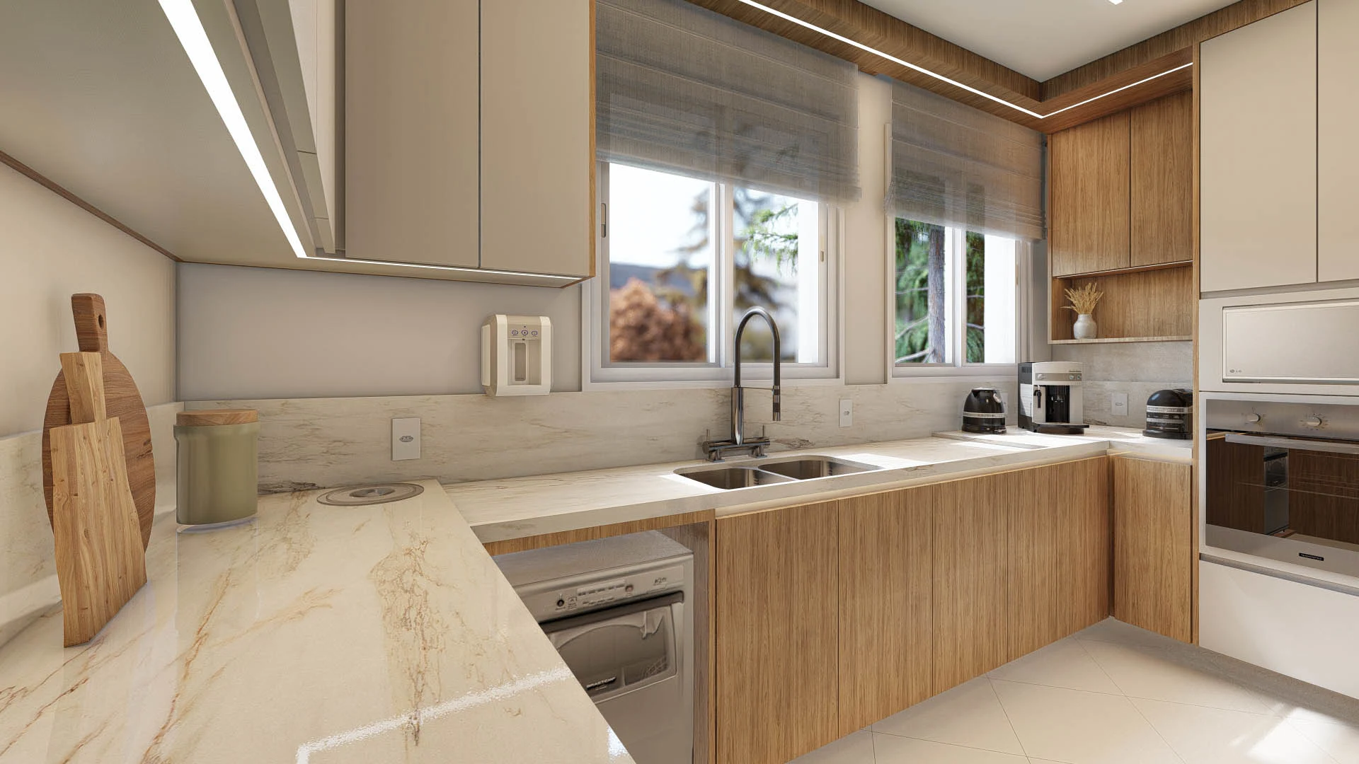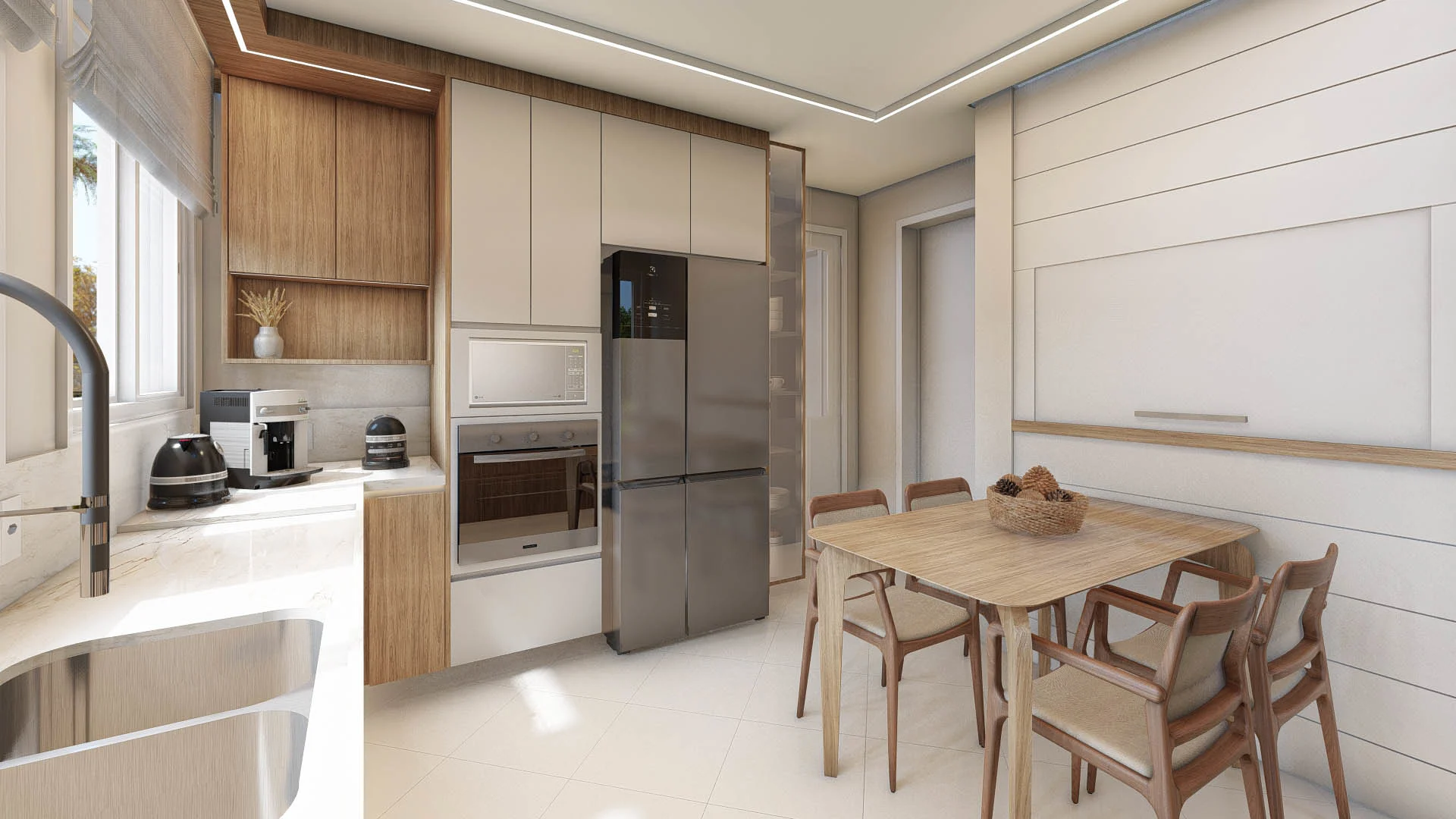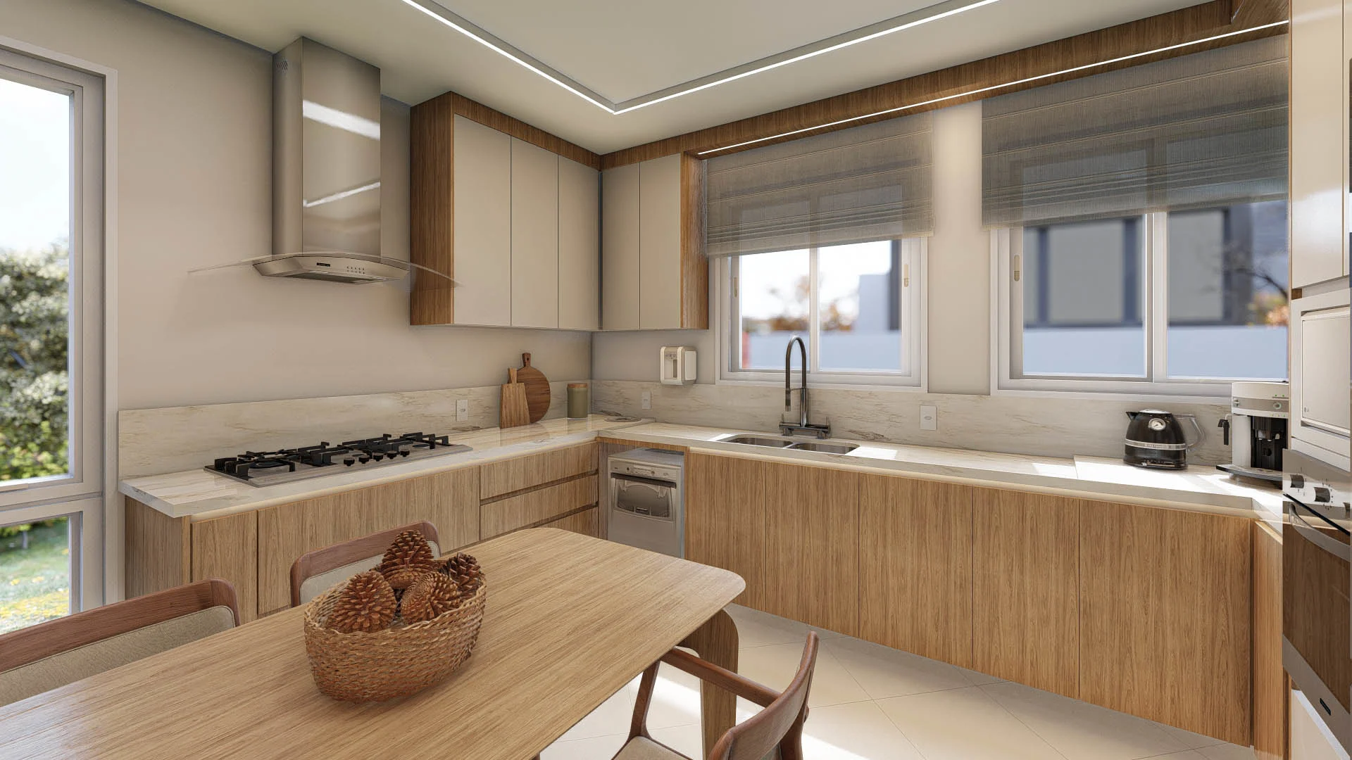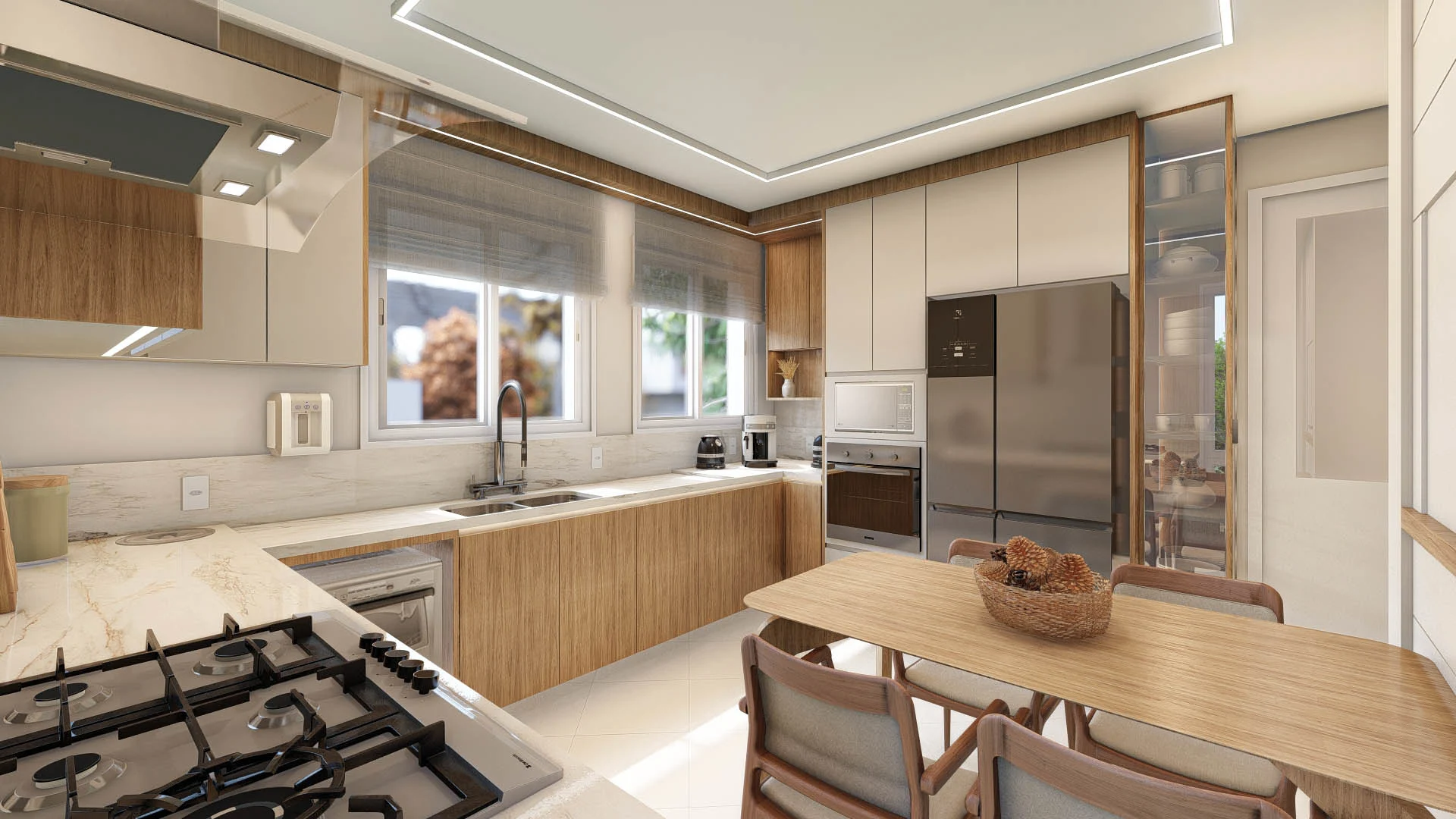 Contando ainda com uma luz natural abundante, a textura aconchegante da madeira e uma iluminação linear estratégica, cada detalhe da marcenaria se destaca, criando uma cozinha funcional e um ambiente lindo e acolhedor.
